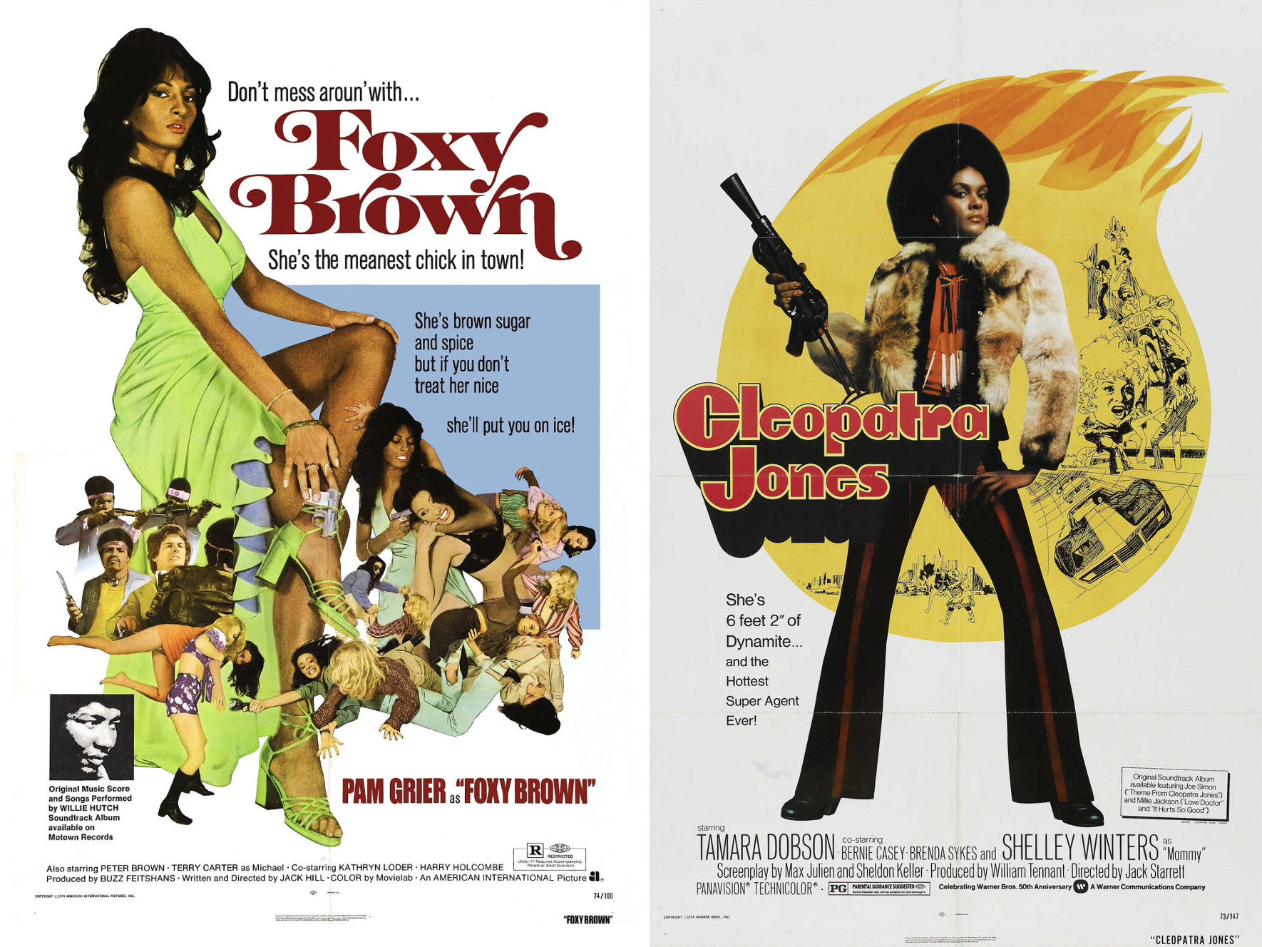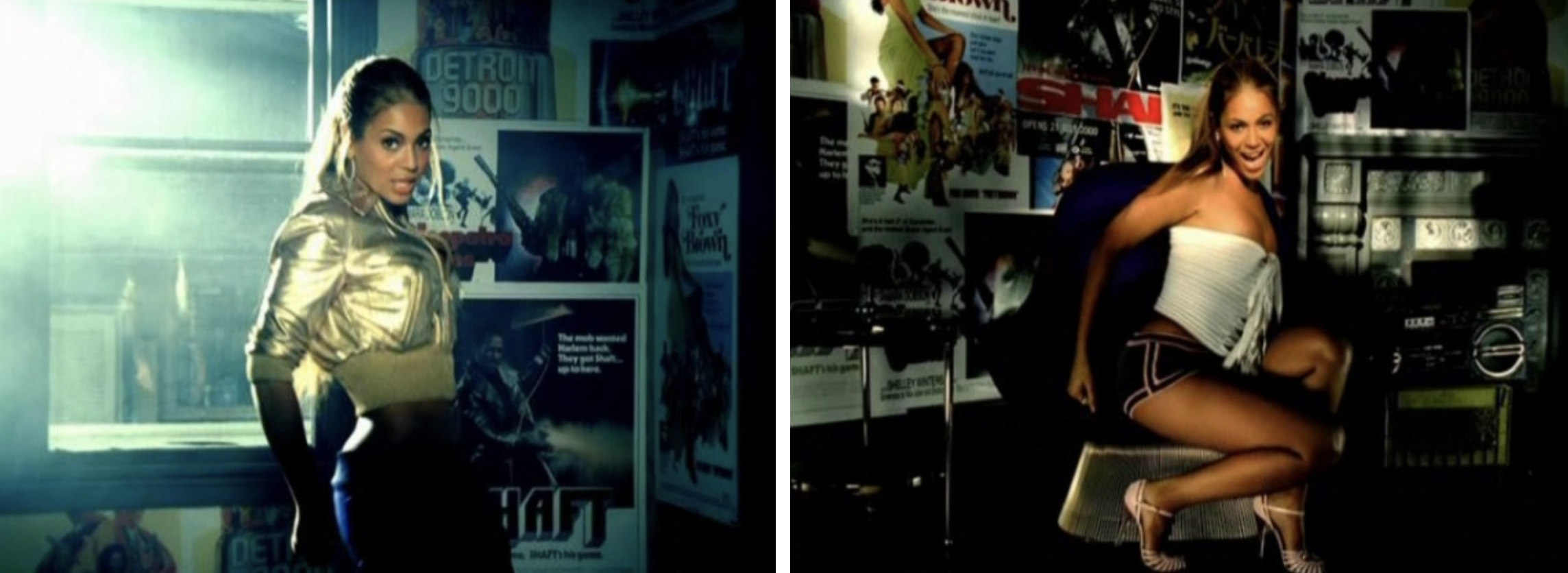 Included on the album were two Beyoncé songs—both released as singles in 2003—that aren’t sung as Lilly in the film. The bigger hit was “Summertime,” a collaboration with the artist then known as P. Diddy. (It was one of three tracks she’d later be seen performing in Fade to Black [2004], Patrick Paulson and Michael John Warren’s documentary about Jay-Z.) But more fun and useful to me is “Fighting Temptation” with Missy Elliott, MC Lyte, and Free. In the video, helmed by Antti J., one of Beyoncé’s set-ups has her in an apartment that’s decked out in blaxploitation posters. The two films from which Foxxy took her name are represented, but so are genre classics like Shaft (1971) and Detroit 9000 (1973).