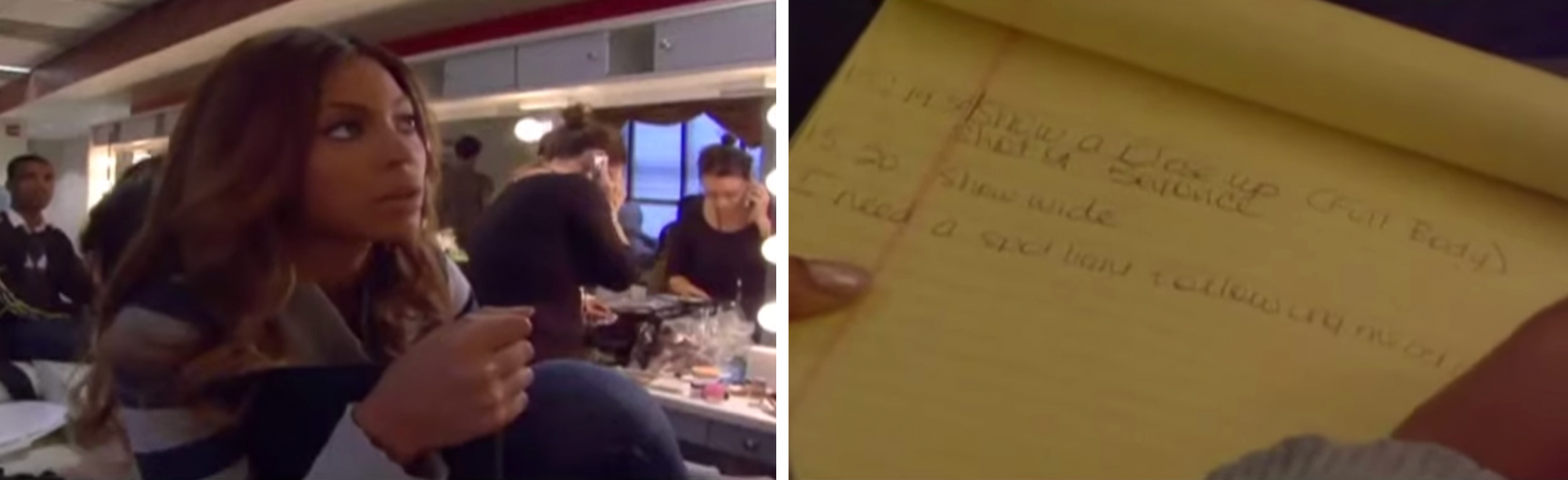 The film also gives us our first onscreen glimpse of Hamish Hamilton, a live TV mainstay and director of that year’s VMAs, whose name will pop up later. After Beyoncé watches back her only allotted run-through of the performance, she’s unhappy with the camerawork and the lighting, and delivers the Beyhive-famous line that “you can’t [put] blue lights on Black girls.” We see her write up a page of detailed production notes for Hamilton’s crew, telling her team while Solange looks on silently, “I can’t trust them, they don’t know what they doing.”