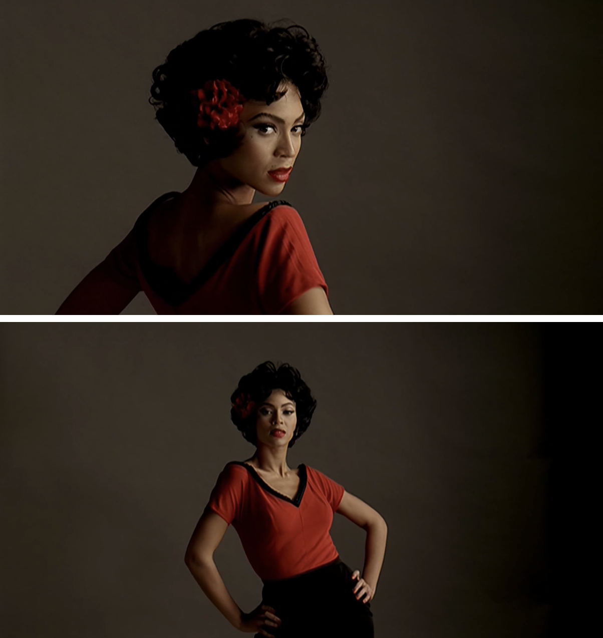 There was also a third video that had premiered on Making the Video, this one directed by Diane Martel but again making Beyoncé and Deena two sides of the same coin. The star performs “Listen” in an empty theatre wearing a Wonder Woman shirt and jeans, which is to say seemingly as herself—until the bridge, when she’s suddenly refashioned into a glossy updo and gown more obviously recalling Deena. Here’s a handy comparison of all of these different versions, plus the actual “Listen” scene from the film: