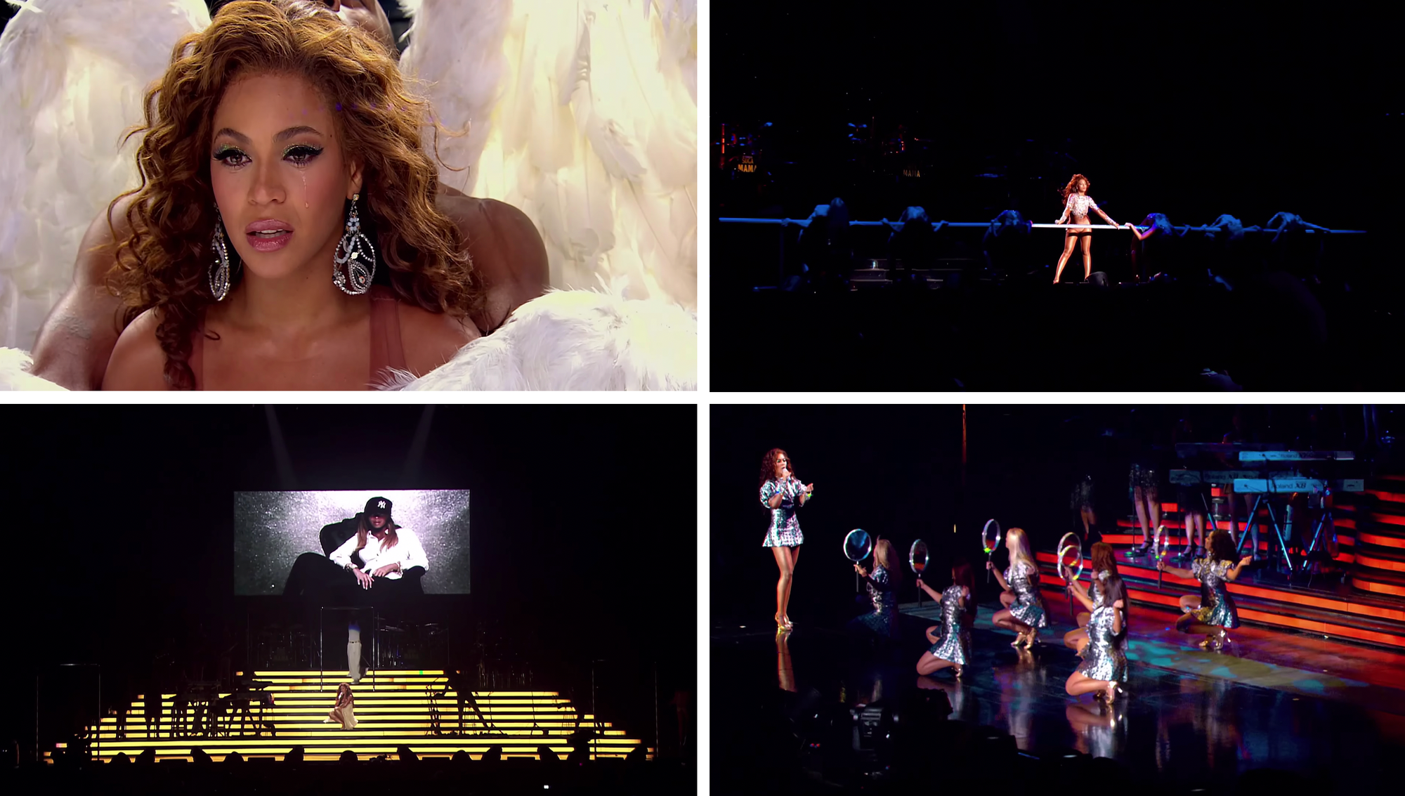 As usual, there’s some Fosse, both through a nod to “Cell Block Tango” from Chicago and the return of the “Big Spender” bar from Sweet Charity, which serves as the main dance prop for the Destiny’s Child medley. Beyoncé’s recent film work is again incorporated, but in a way that feels splashier and even hammier than it did in Live at Wembley. Both “Check On It” and Henry Mancini’s original Pink Panther theme are made part of the show, and there’s a spy movie-themed segment where her dancers carry massive magnifying glasses.