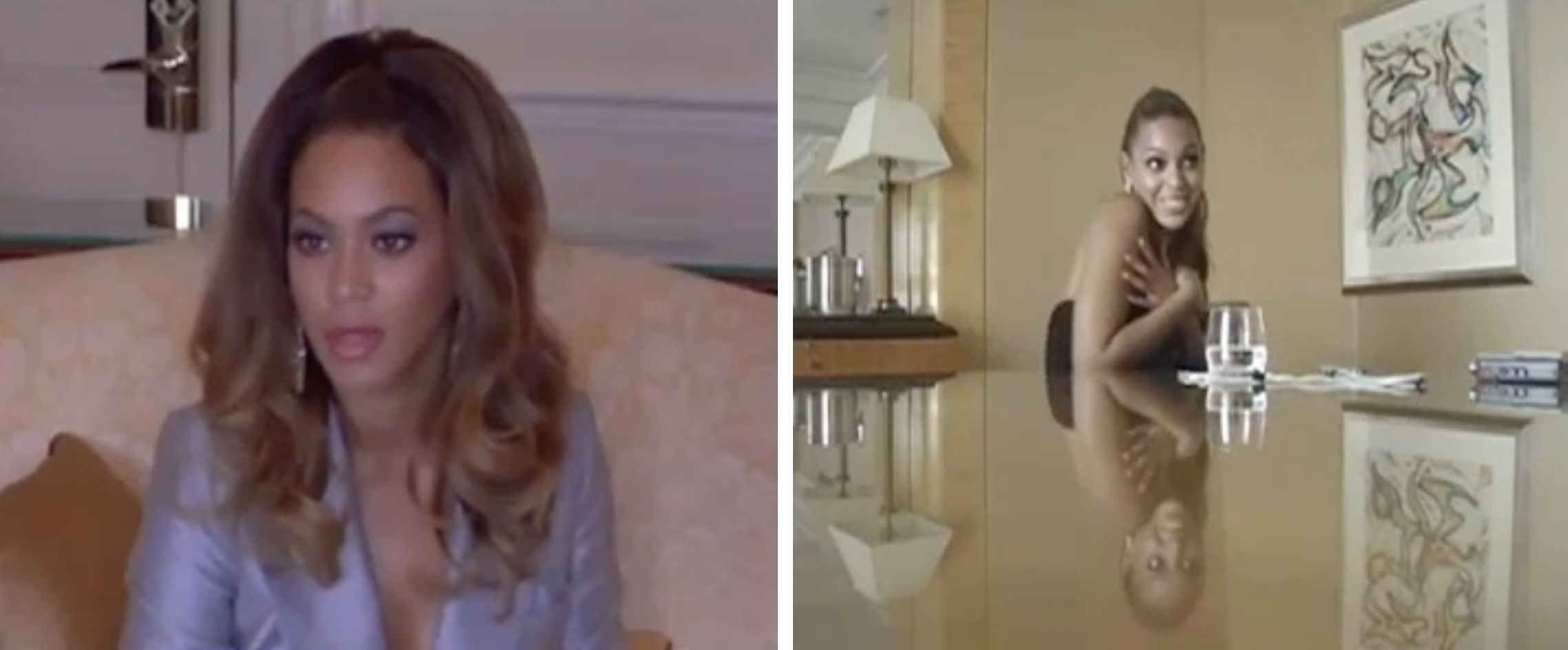 The short is arguably most interesting these days for its tone—strikingly ambivalent about fame itself—as well as its style—aligned in many ways with future Beyoncé projects. Included is an extended montage of the star doing interviews from the previous couple of years, which is to say fielding an onslaught of uninteresting and sometimes invasive questions: “Are you afraid of getting old?” “Does size matter?” “What about getting the ring on the finger?”
