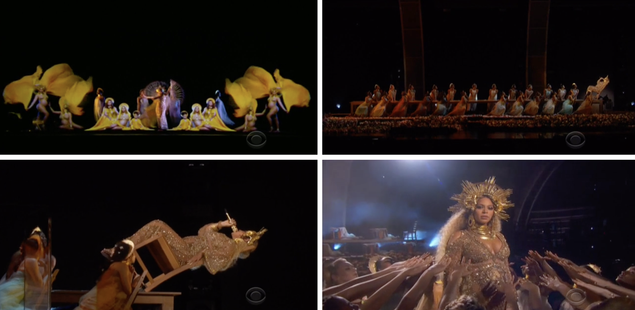 Following an intro from Ms. Tina, she chose to sing two never-performed ones, “Love Drought” and “Sandcastles.” As had also been true of “6 Inch”/“Haunted”/“All Night” at that Tidal event four months prior, there was first a prologue that saw her perform alongside a screen-projected version of herself and her dancers, though she was joined this time by projected versions of her mother and daughter, too. Together, the three generations invoked several bits of religious and spiritual iconography, drawing on some of the same references that had inspired both Lemonade and Beyoncé’s pregnancy shoot.