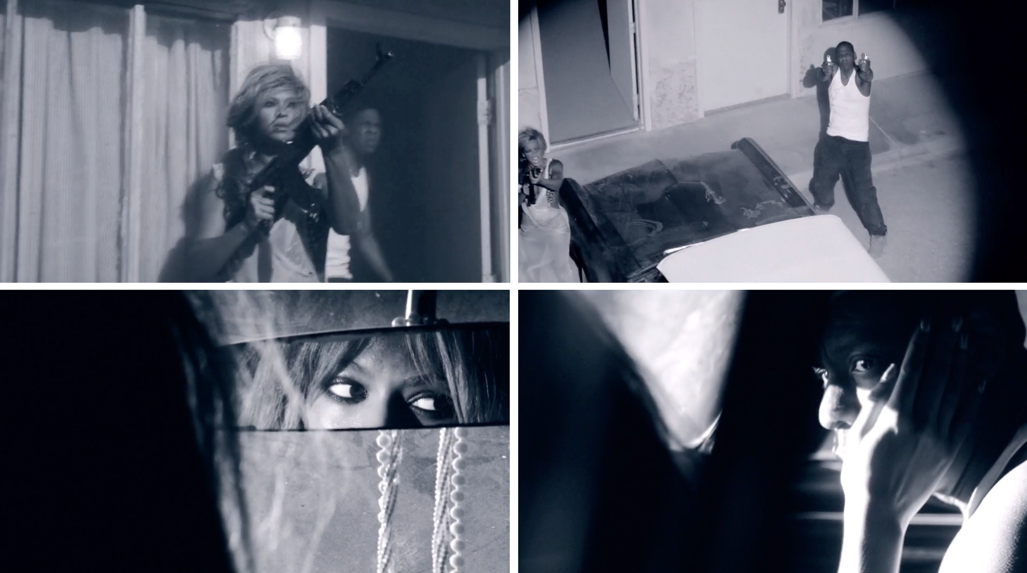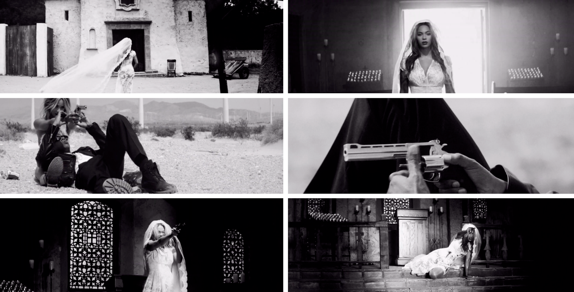 Beyoncé walks herself down the aisle, the space completely empty—or rather, it seems that way until she’s attacked by a spray of bullets, unsuccessfully attempting a couple of shots herself. We never see who’s shooting at her, and perhaps it’s all metaphorical anyway; we keep cross-cutting to a past moment where Jay-Z’s character was teaching hers how to load and fire a gun. So while bang, bang, someone shoots her down—whether that’s her baby, it’s not clear—she’s unable to match that violence.