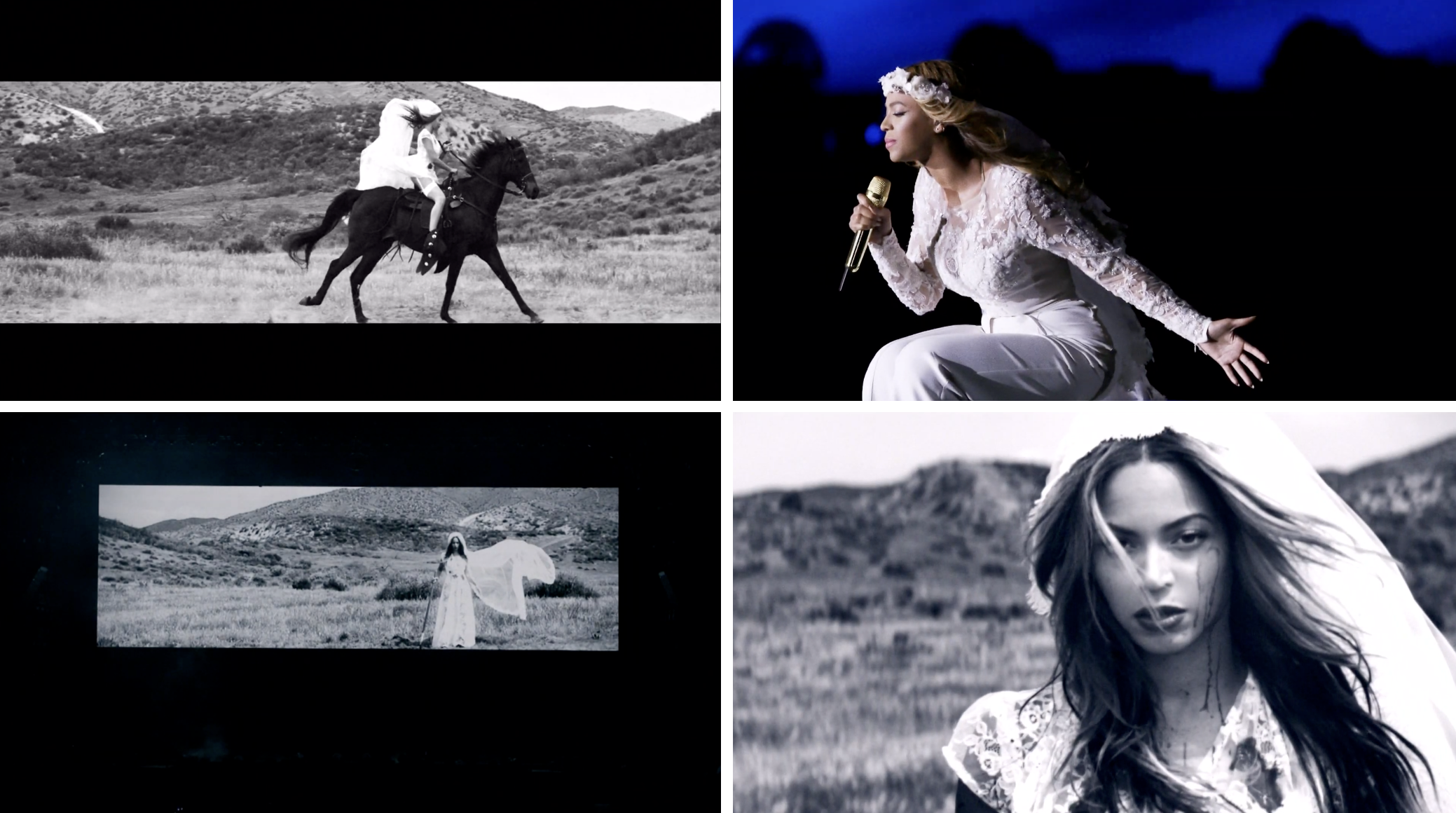 Before that happens, though, we get the demise of Beyoncé and Beyoncé alone. While Jay-Z performs “Song Cry”—a track recorded in the spring of 2001, and apparently inspired by a trio of relationships he’d messed up before Beyoncé was really in the picture—the big screen shows us her character arriving at a church in the middle of the desert. Dressed in bridal garb, it’s almost certainly a nod to the same opening moments of Kill Bill that I mentioned earlier, where the Bride is given enough retributive fuel to power a Tarantino martial-arts duology.