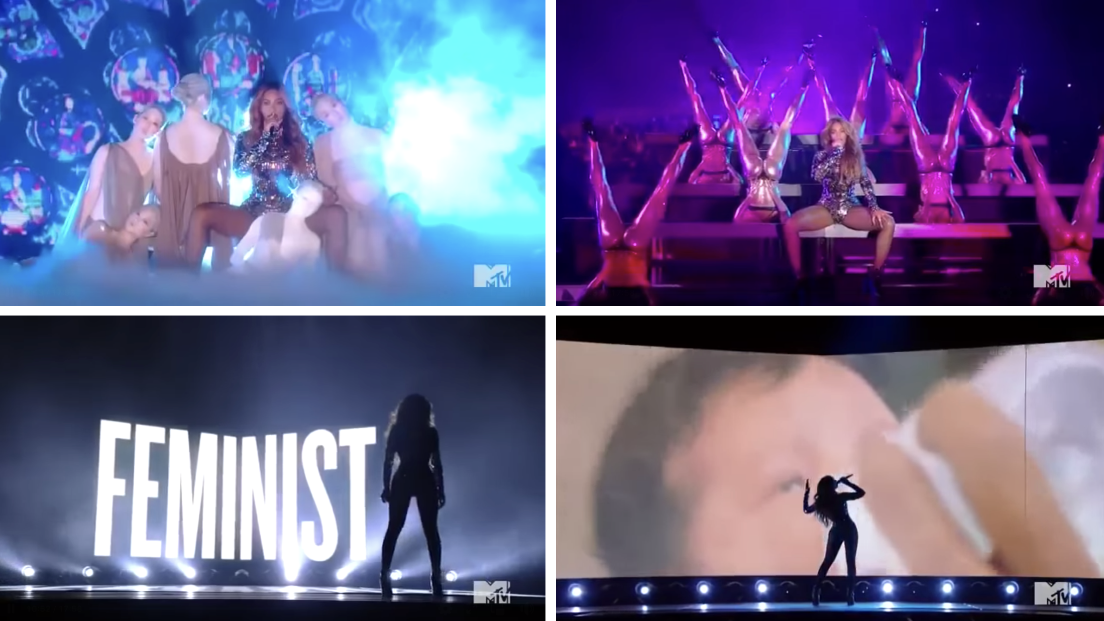 Unlike your average Vanguard performance, which is typically a greatest-hits showcase, the star took her 15 minutes to perform almost all of BEYONCÉ, translating its videos into live concepts. There she was recreating her own Pietà nod from “Mine,” and playing as a Crazy Girl the way she had in “Partition,” and standing silhouetted in front of a massive “FEMINIST”—in what would arguably become the performance’s most-circulated image. A little differently, “Blue” had Beyoncé backed by mostly never-before-seen footage of her daughter, leaving everyone in the crowd visibly moved.