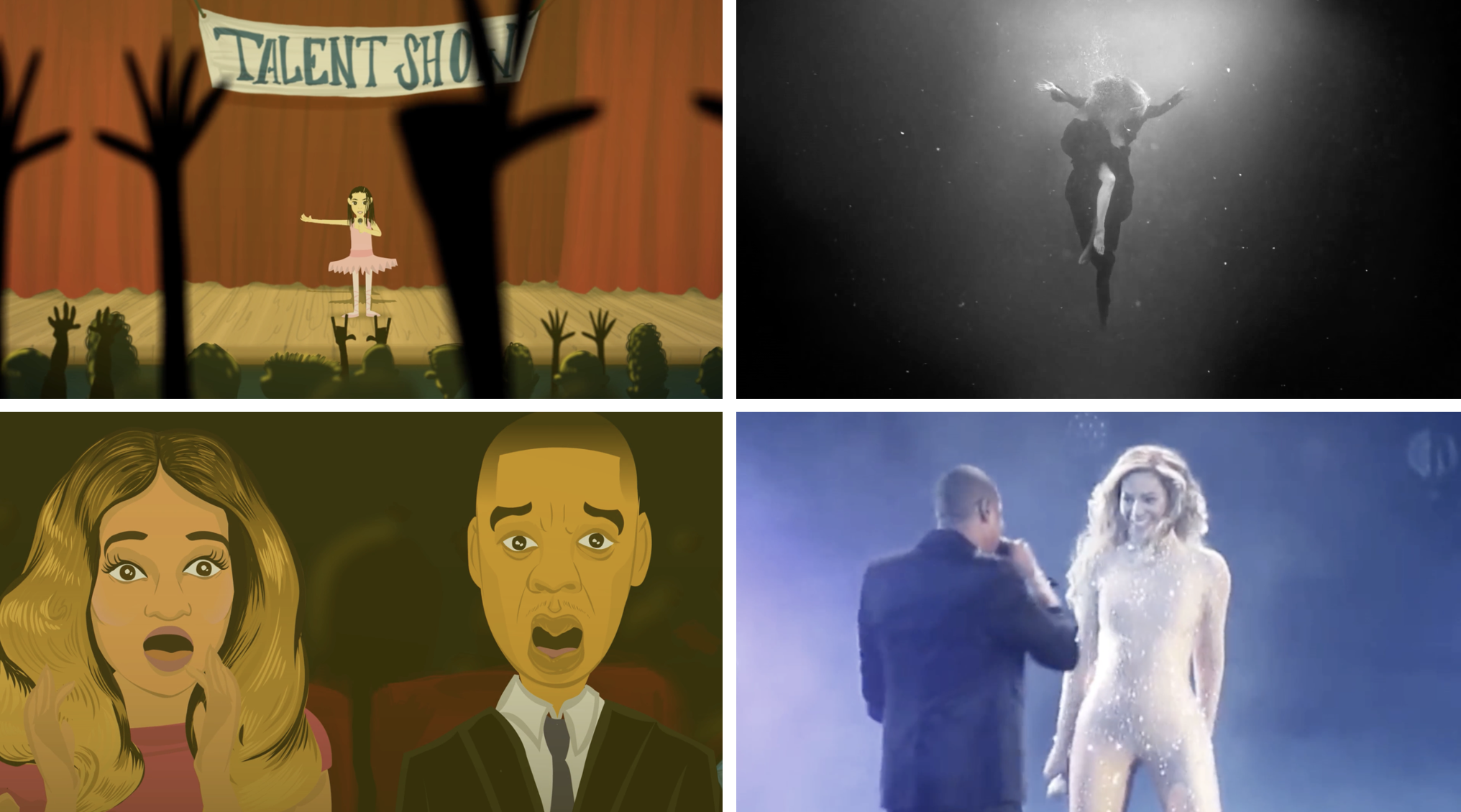 But she’d indeed appear in three “Short Films”—one dropping just after this chapter’s timeframe, though I’m including it here for storytelling’s sake. In “Blue’s Freestyle” (2018), directed by Maurice Taylor, her cartoon self appears alongside Mr. Carter’s as the couple (plus their twins) watch Blue go rogue at a talent show, rapping instead of dancing ballet.