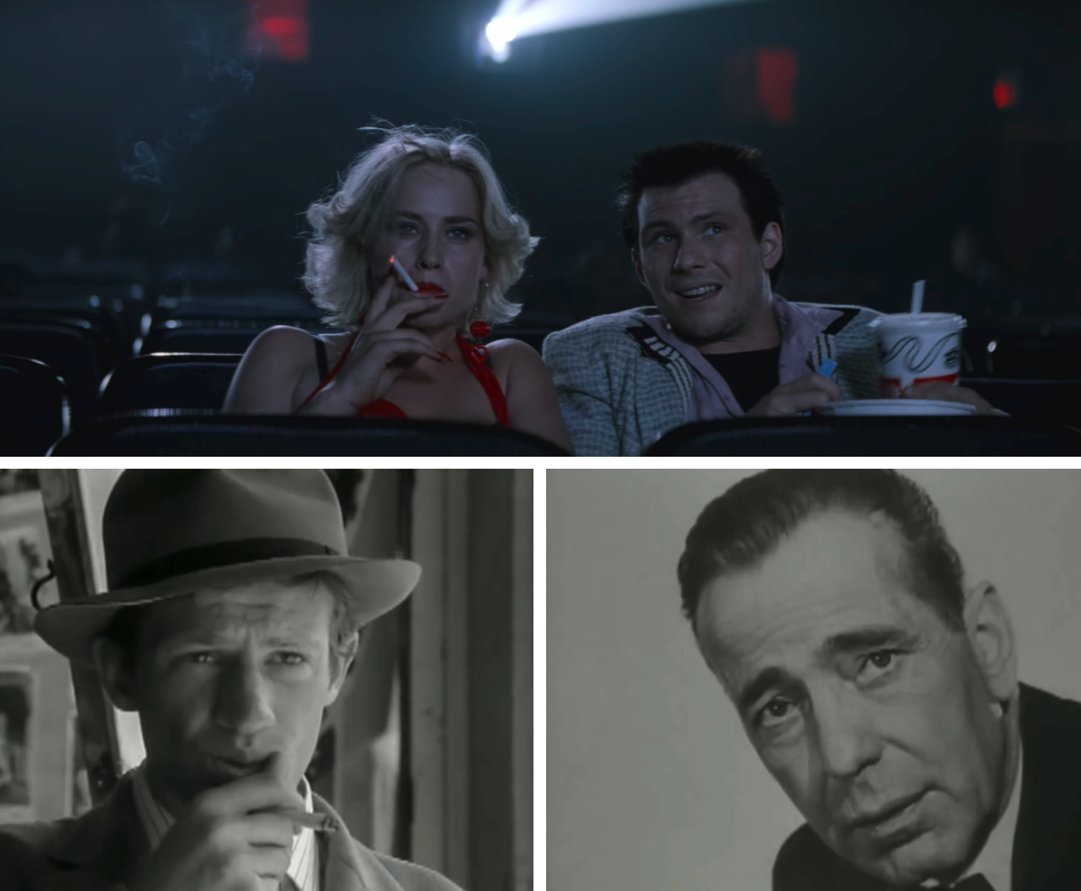 In True Romance, Clarence and Alabama meet during a screening of the Japanese martial-arts film The Street Fighter (1974). Tony Scott’s 1993 crime drama then forces the instantly-smitten couple on the run with a bag of cocaine, and as Dan put it, is “very much the daydream of a juvenile movie nerd, made into an implausible hero.” (Multiple characters also work in the film industry proper.) In Breathless, which contains various references to classic films noir, Michel (Belmondo) is particularly obsessed with Humphrey Bogart, at one point gazing admiringly at promo material for The Harder They Fall (1956). Tarantino’s Kill Bill films similarly recreate and remix a wealth of film references, including from the director’s own oeuvre.