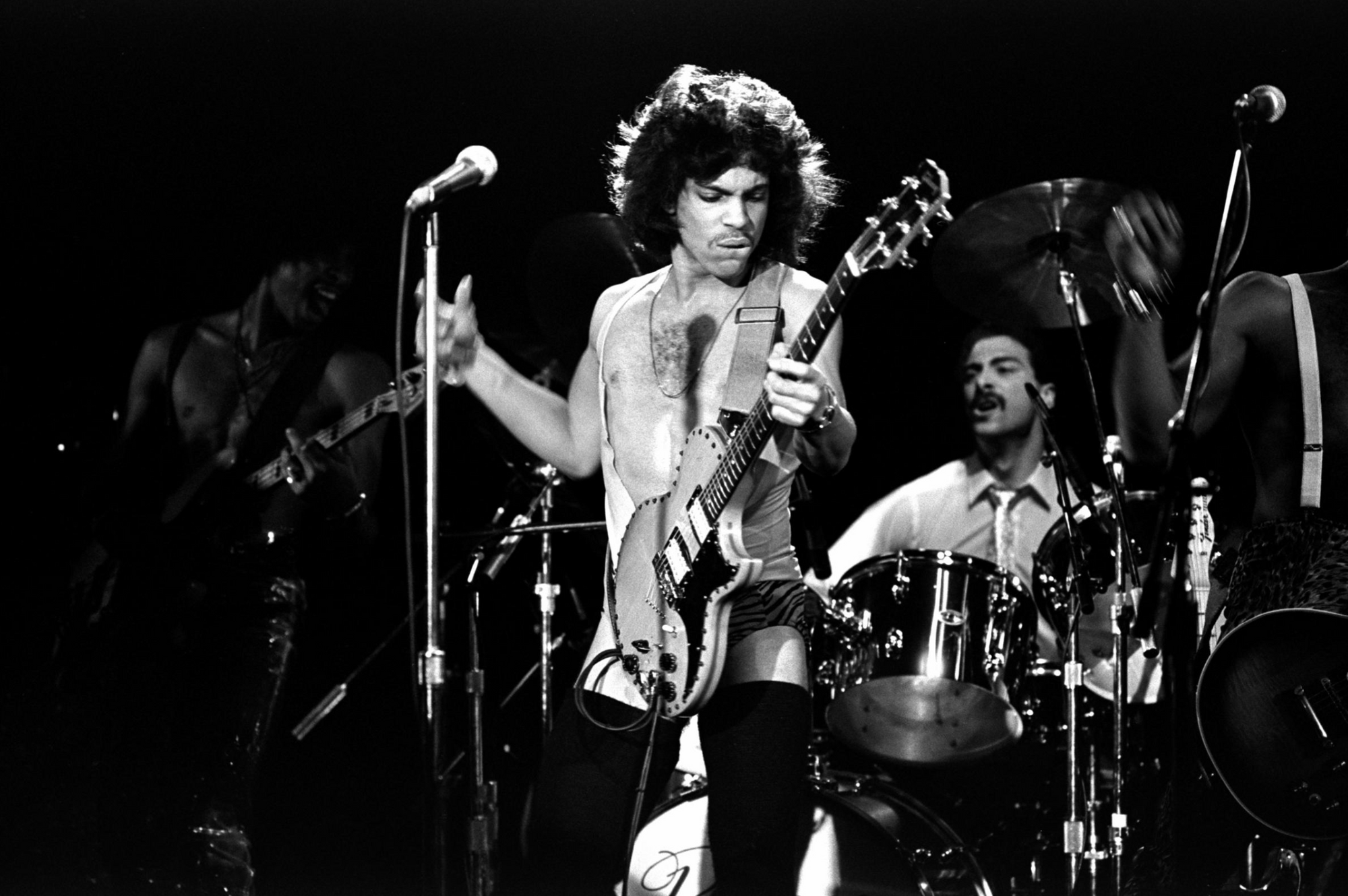 I do really like Prince in the late ‘70s because it’s Prince when he’s unpolished, and you can tell that he’s wearing thrift store clothes, and things don’t fit properly, and things are ripped at the seams, and you re-wear stuff. Like the leg warmers, for example, are probably one of my favourite items that he’s worn because you can see a direct lineage from him wearing those leg warmers… Was it because he did dance when he was younger? Was it because it was cold in Minnesota? Were they in fashion? But then you can see them morphing into this salacious statement. Is it women’s hold-ups you guys call them? Stockings?