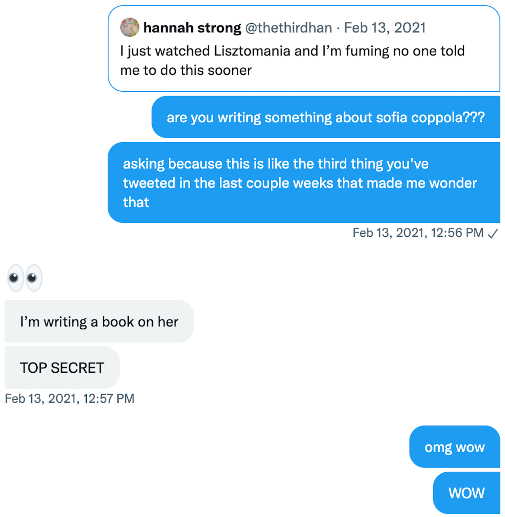 I went back through our Twitter DMs to get a handle on the timeline. And I’d forgotten that I sleuthed out that you were writing something about Sofia Coppola, because I think you were deep in the Marie Antoinette portion of your research at the same time as I was for a different thing. And there’d been offhand tweets I’d seen that I was curious about, but then you one day tweeted something about Lisztomania (1975). Which is such a specific and curious reference, not even one of Ken Russell’s better-known films, so I was like, “Okay.”