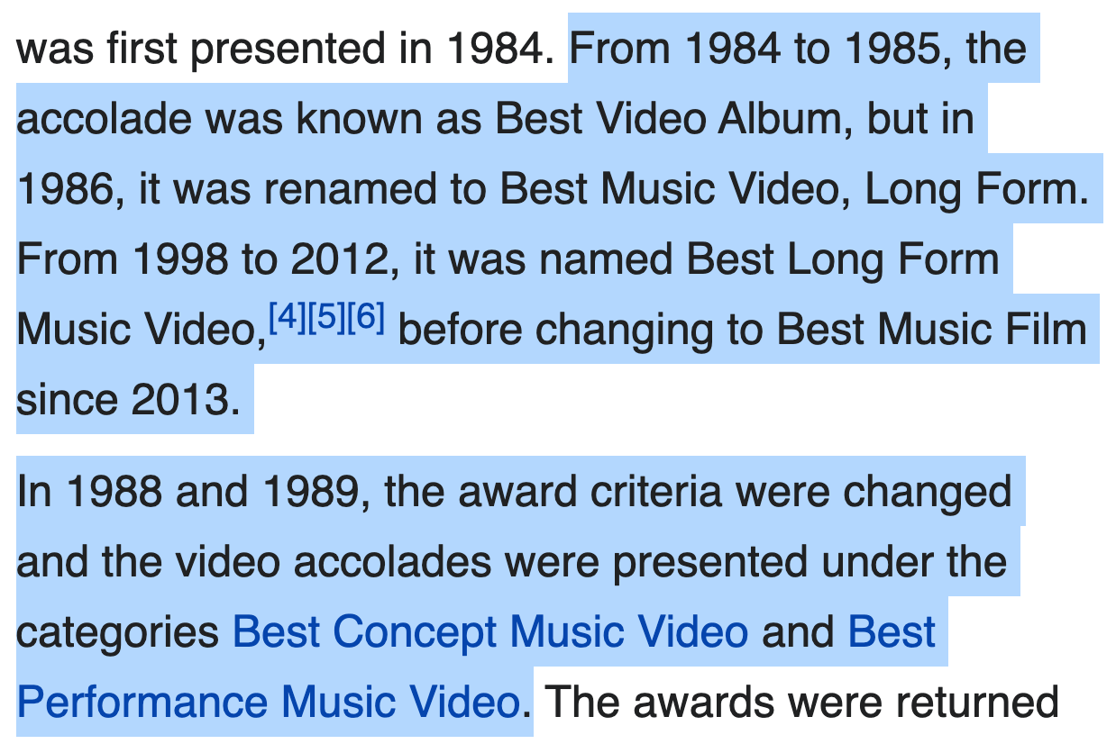 The visual category that more urgently needs breaking up is arguably Best Music Film. Since its inception in 1984, the award has seemingly had constant identity crises to keep up with the sort of long-form visual work that comes out of the music industry. Aside from Best Music Film, it’s been called *checks notes* Best Video Album; Best Music Video, Long Form; Best Concept Music Video; and Best Performance Music Video. In pivoting to Best Music Film, as it did in 2013, the Recording Academy had opted to go broader with the category instead of introducing any new ones, deciding that wildly different long-form projects should just continue competing against each other—90-minute biographical documentaries, 150-minute concert films, 60-minute visual albums, 15-minute music films, etc. The nominees tend to be all over the place. But while seemingly anything goes in terms of nominations, the Academy hasn’t actually awarded anything that’s not a traditional music documentary or concert film since 1993, when Annie Lennox won for her Diva (1992) visual album. This has been true regardless of the quality of the work in question. It’s why Beyoncé’s Lemonade [2016] lost to Ron Howard’s The Beatles: Eight Days a Week [2016], but Beyoncé’s Homecoming [2019] won over Paul Thomas Anderson’s Anima [2019].) At the very least, there should be one category for concert films and documentaries, and another for longer-form music video work; these are worlds apart, and the system is currently set up to pay dust to anything even remotely experimental or boundary-pushing.
