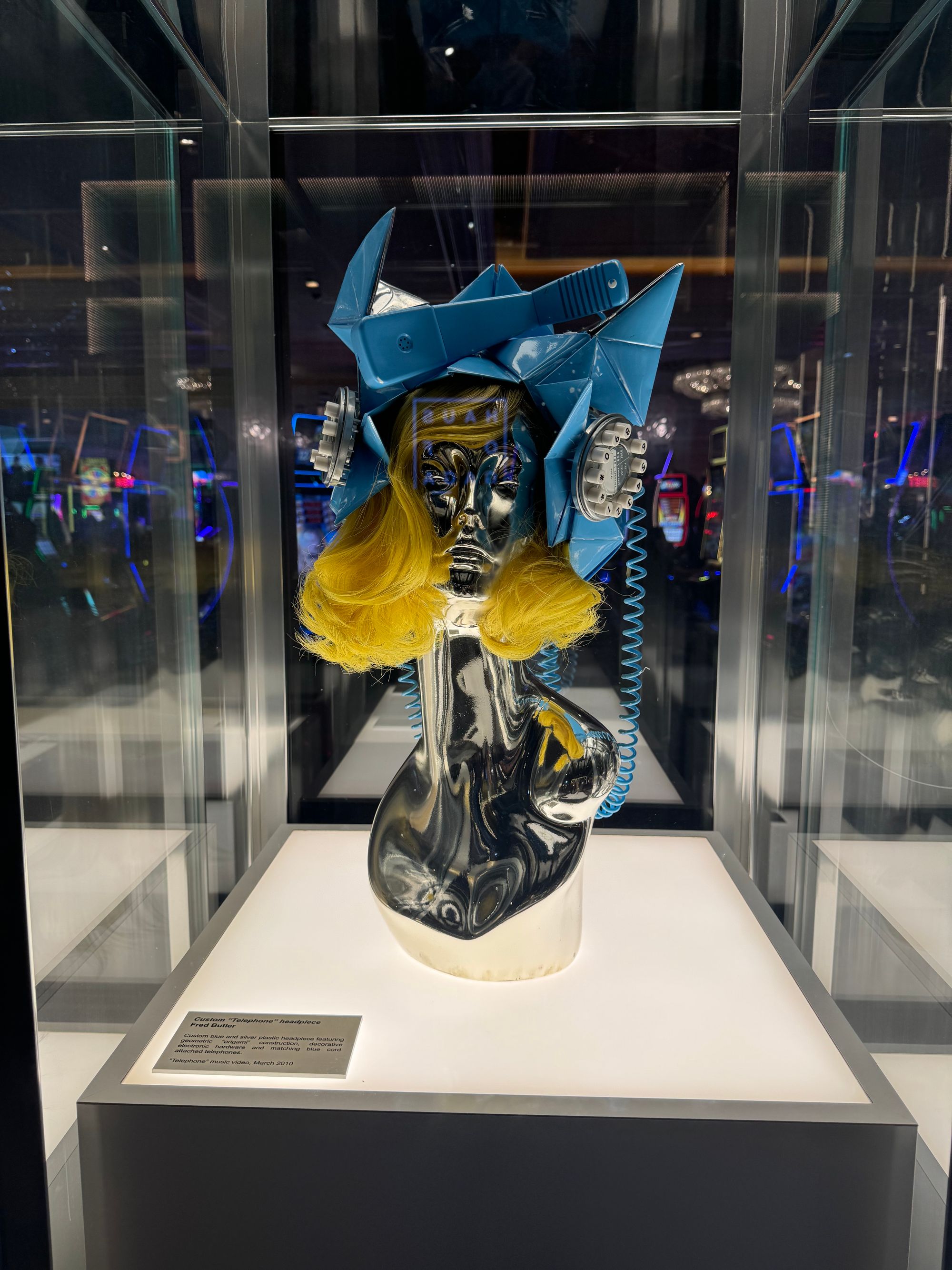 Outside the Dolby Live theatre in the Park MGM Hotel, where Gaga has performed her residency throughout its run, there’s a merch shop/exhibit spanning her recording career. It’s mostly costumes or pieces of them, like her blue bodysuit from “Poker Face” (2008) and a taxidermized Meat Dress, but there are a couple other oddities: one of her keytars, one of her Golden Globes, the egg in which she entered the 2011 Grammys. When we first arrived at the hotel on the Friday evening, exhausted from the two flights and especially the shock of the desert heat upon landing, the exhibit was closed for the night. We’d get our fill of it the next day, but in the meantime I stared at the back of the headpiece from “Telephone” (2010) through the glass and felt my eyes well up with tears. Here it was from the front: