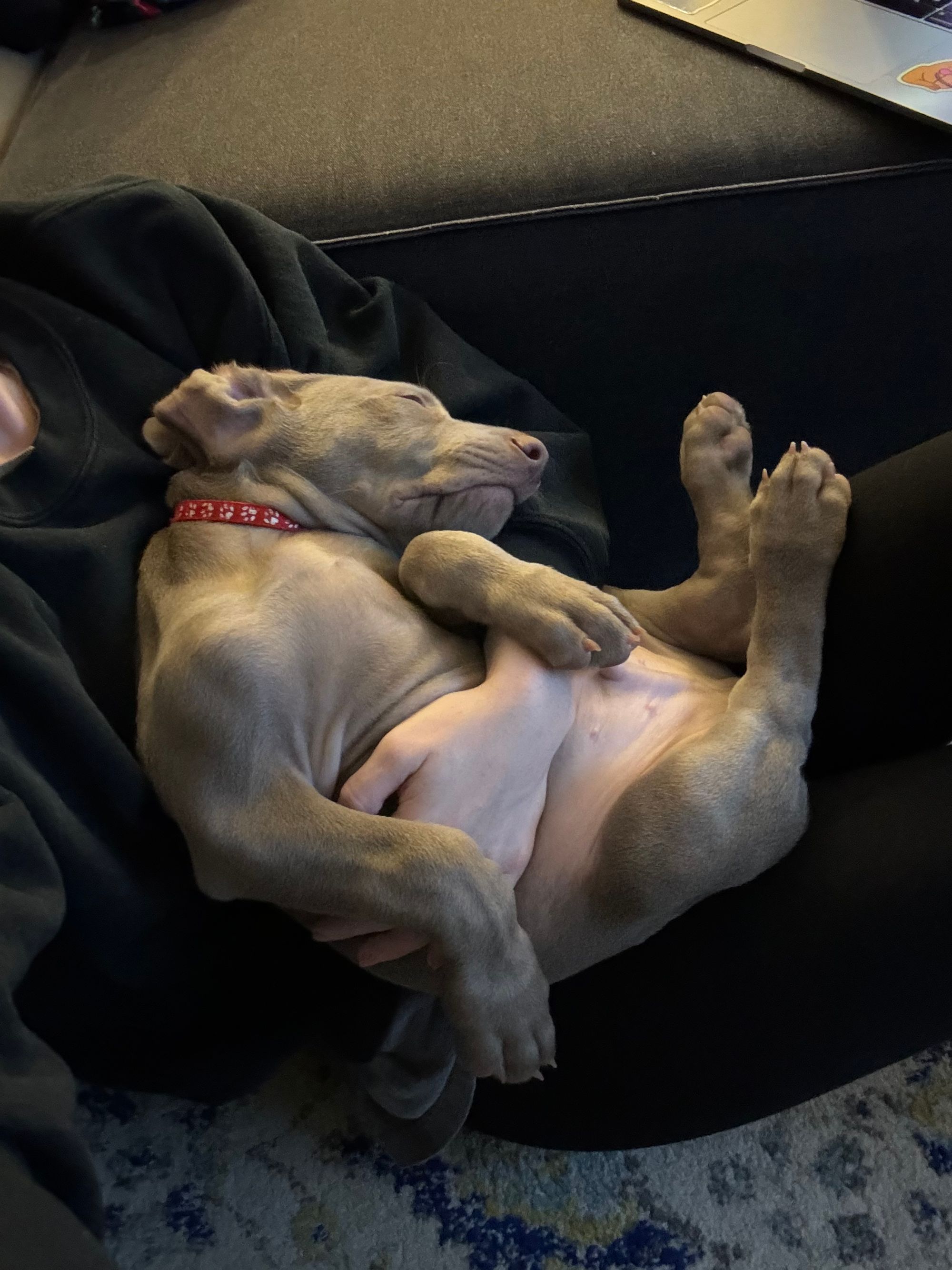 The Roy section (hereafter to be integrated into The life section, probably): Maybe a year and a half ago, I started joking whenever tipsy about the theoretical dog I wanted to have one day named Roy (which I generally find a funny name for a dog, but it’s also what Goldie Hawn won’t stop calling her “son” Travis in Overboard [1987] because she has amnesia—just a bit I’ve always really enjoyed). The joke then at some point became “my Weimaraner Roy” because I liked the idea of having a big dog a couple years out, or whenever we did decide to get him. Unbeknownst to me, Scott secured my Weimaraner Roy sometime in September, and then surprised me in mid-October holding him (wrapped up in a bow) in our doorway.