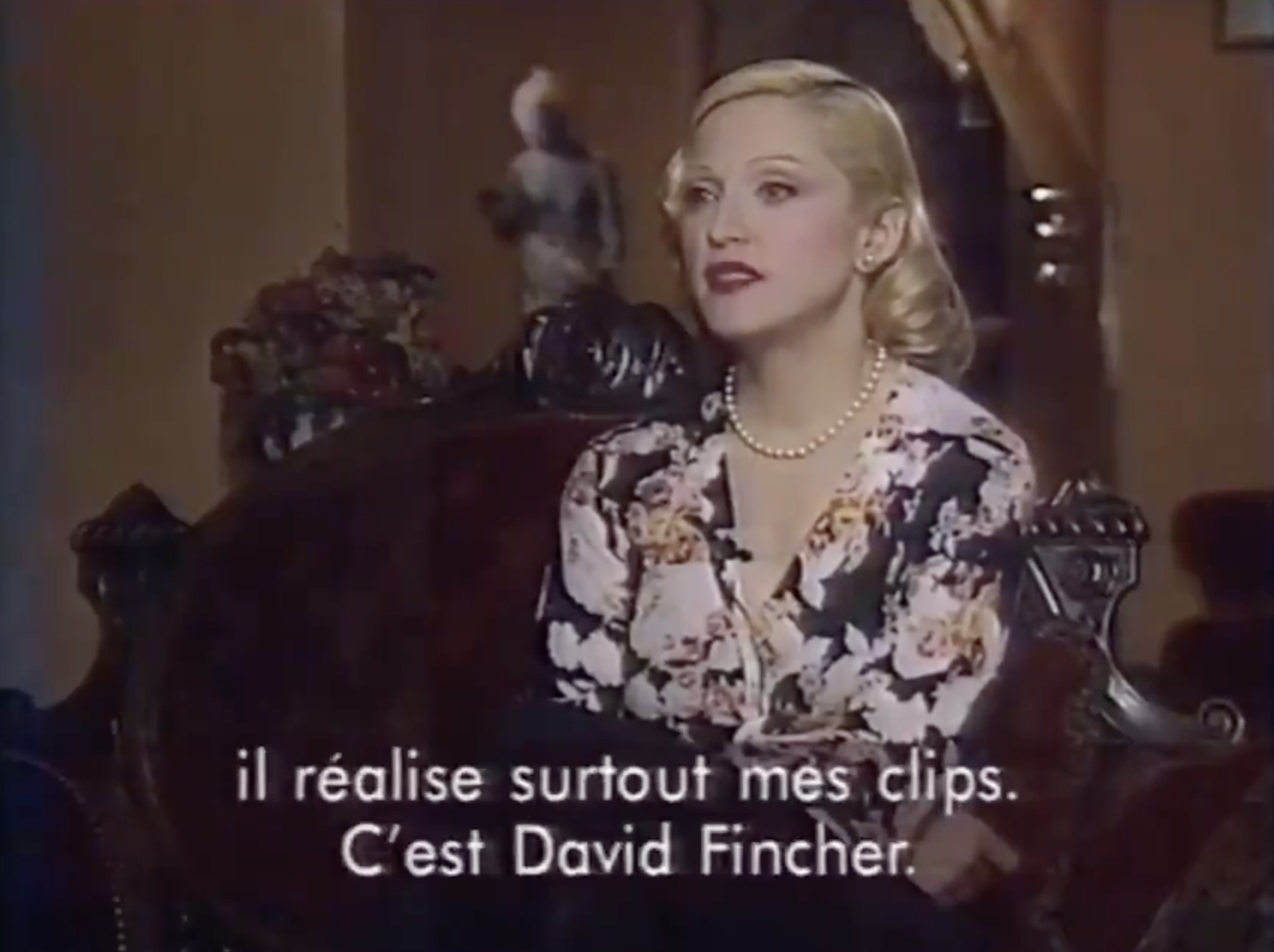 What struck me about the anecdote was the “hidden in plain sight”-ness of it all. The relationship was and remains off-the-record enough that Fincher doesn’t tend to appear in the listicles chronicling Madonna’s impressive love life as a public figure. They were never photographed together in any non-professional setting. Fincher won VMAs for their collaborations in both 1989 and 1990, but didn’t mention Madonna in either acceptance speech. And yet, the videos they made together were some of Madonna’s most personal and sexually provocative. Interviews and behind-the-scenes stories from the Like a Prayer (1989) and Erotica (1992) eras are full of signs that the two were engaged in extracurricular activities. There’s lots out there already about the videos themselves, so my main goal with the rest of this is to revisit them specifically for what we can learn about those extracurricular activities. As Raza Syed wrote for Vice in an overview of their collaborations, “Two notoriously exacting talents—the ingénue, the wunderkind—seized on each other’s velocity at precisely the right moment.” (Schwing.)